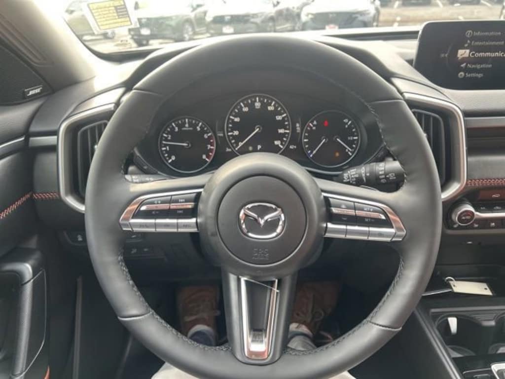 AWD 6-Speed Automatic 2.5L I4 Turbocharged DOHC 16V LEV3-ULEV70 227hp 12 Speakers, 4-Wheel Disc Brakes, ABS brakes, Air Conditioning, Alloy wheels, AM/FM radio: SiriusXM, AppLink/Apple CarPlay and Android Auto, Auto High-beam Headlights, Auto-dimming Rear-View mirror, Automatic temperature control, Brake assist, Bumpers: body-color, Compass, Delay-off headlights, Driver door bin, Driver vanity mirror, Dual front impact airbags, Dual front side impact airbags, Electronic Stability Control, Emergency communication system: MAZDA CONNECT, Exterior Parking Camera Rear, Front anti-roll bar, Front Bucket Seats, Front Center Armrest, Front dual zone A/C, Front reading lights, Front wheel independent suspension, Fully automatic headlights, Garage door transmitter: HomeLink, Heads-Up Display, Heated door mirrors, Heated front seats, Heated rear seats, Heated steering wheel, Illuminated entry, Knee airbag, Leather Seat Trim, Leather Shift Knob, Leather steering wheel, Low tire pressure warning, Memory seat, Navigation system: MAZDA CONNECT, Occupant sensing airbag, Outside temperature display, Overhead airbag, Overhead console, Panic alarm, Passenger door bin, Passenger vanity mirror, Power door mirrors, Power driver seat, Power Liftgate, Power moonroof, Power passenger seat, Power steering, Power windows, Radio data system, Rain sensing wipers, Rear seat center armrest, Rear window defroster, Rear window wiper, Remote keyless entry, Speed control, Speed-sensing steering, Split folding rear seat, Spoiler, Steering wheel mounted audio controls, Tachometer, Telescoping steering wheel, Tilt steering wheel, Traction control, Trip computer, Turn signal indicator mirrors, Variably intermittent wipers, Ventilated front seats, Wheels: 18 x 8J Aluminum Alloy Black Metallic Finish.
